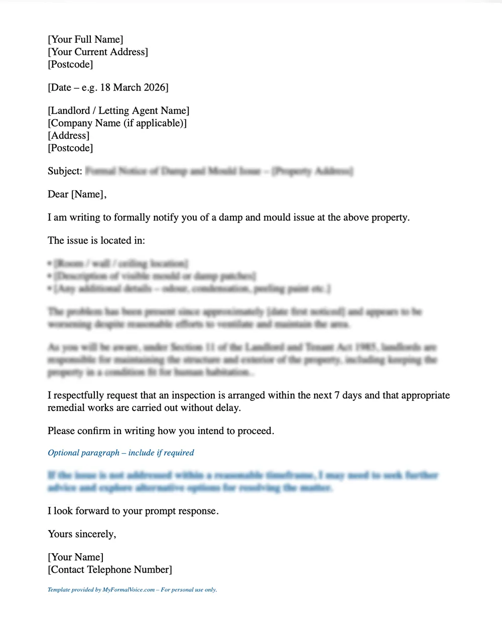This professionally structured UK damp and mould complaint letter template helps you communicate your concerns confidently while maintaining a calm and legally appropriate tone.